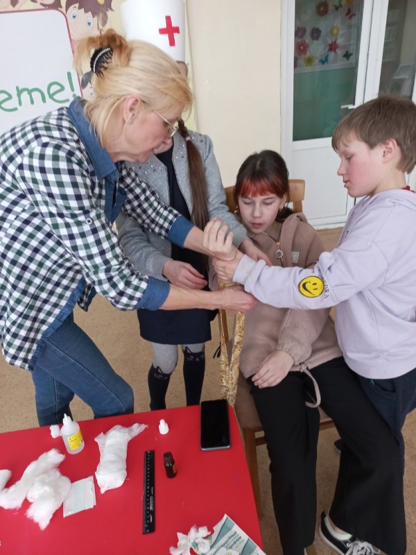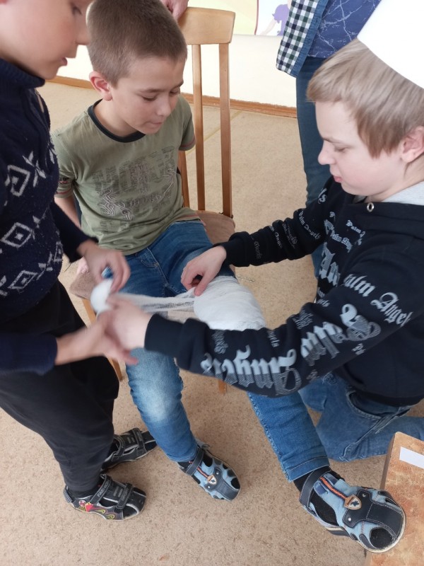 Участники учились бинтовать ушибленные и поражённые места, обрабатывать раны.