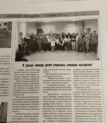Газета "Советское Беломорье" поделилась радостной новостью об открытии нашего проекта "Семейная мастерская "Создавай и вдохновляй"! Этот проект стал возможен благодаря поддержке Фонда поддержки детей, находящихся в трудной жизненной ситуации. Публикация в издании подчеркивает социальную значимость нашей деятельности и вселяет уверенность в том, что мы движемся в правильном направлении, помогая семьям и детям!